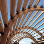 - Manufacturing: Lumber strips, or lamellas, are kiln-dried and planed, then stacked with all grains parallel, unlike CLT’s crosswise arrangement, with adhesives applied between layers; this stack is pressed and cured under heat and pressure to form a strong, solid beam that can be straight, curved, or custom-shaped.